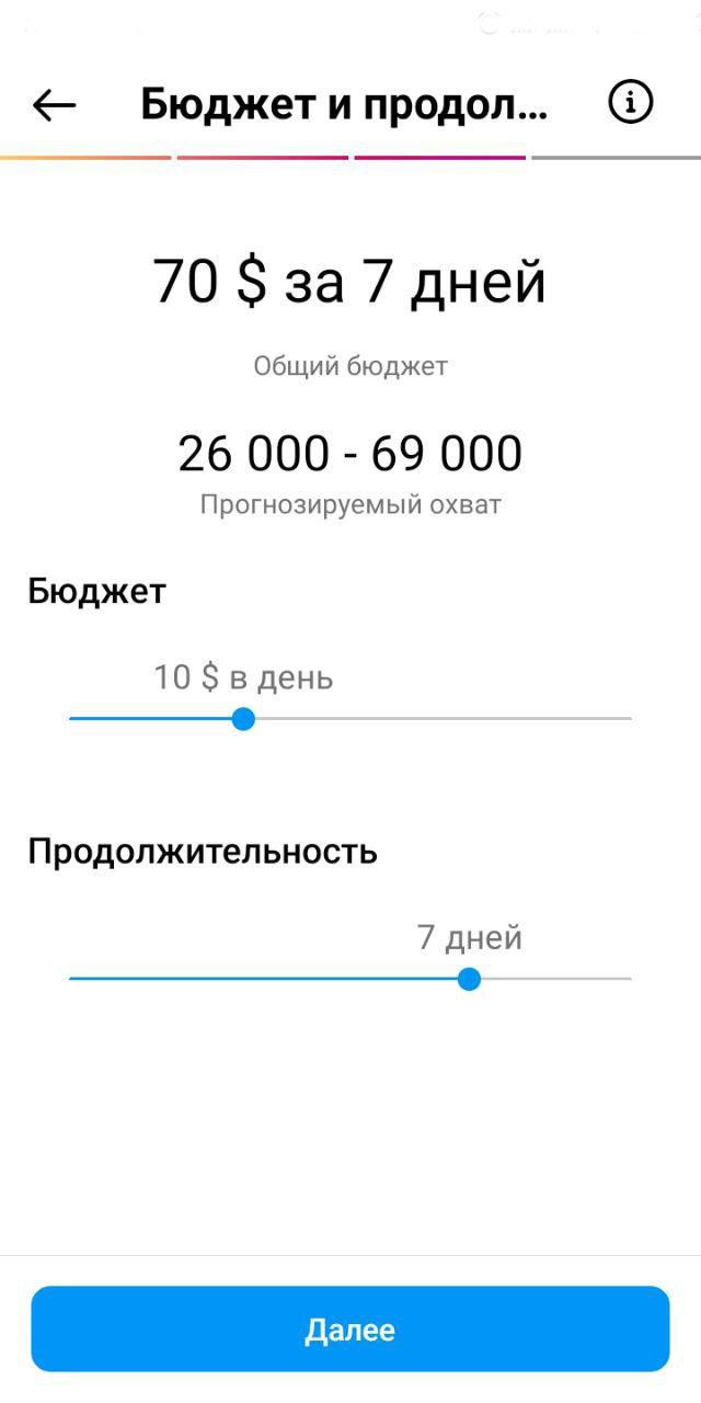 Чем больше задать дневной бюджет, тем больше в итоге людей увидят вашу рекламу. Что кстати выгодно, но не стоит сразу ставить 10-20$ в день начните с маленького бюджета 3-5$ в день, с продолжительностью 7 дней. Для первого старта будет как раз. И самое важно не ждите сразу много заказов или продаж, это начало и вроде кажется просто. Но, только на первый взгляд. Объем продаж зависит от хорошо написанного зазывающего сообщения, фото товара, и правильно выбранного региона. А все перечисленное приходит не сразу, сперва надо совершить ошибки.