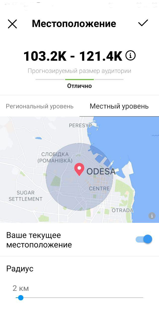 Местный уровень —это ваш город с определённой локацией, не пытайтесь писать свой адрес, а просто выберите «Ваше текущее местоположение» и начиная от вашего места нахождения укажите радиус минимально 1 км, а максимально 30 км.