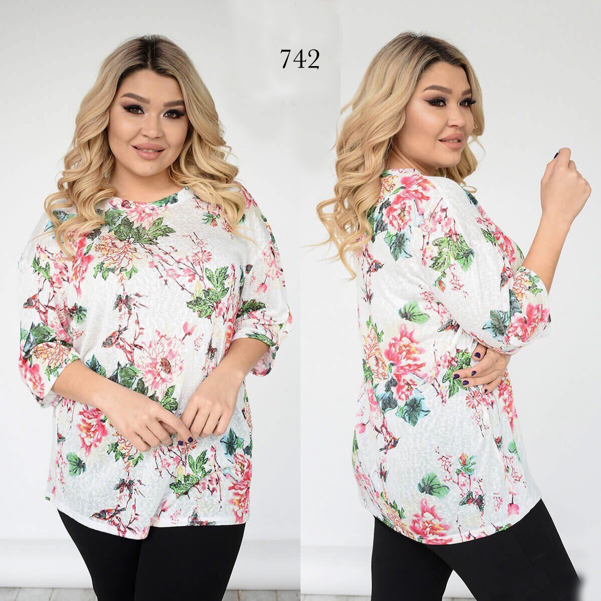Стильная романтическая футболка с ярким цветочным принтом позволит комбинировать в образах различные сочетания с другими предметами гардероба. Модель свободного кроя с рукавами три четверти и круглой горловиной создает выгодные линии силуэта. Рукава на приспущенном плечевом шве дополнены трендовыми патиками с петлей, которые фиксируются на пуговке выше, слегка укорачивая рукав. Такие детали фасона придают образу нотки тренда и стиля луку. Замечательная базовая вещица для создания повседневных комфортных образов в стиле smart casual. Растяжимость ткани хорошая.