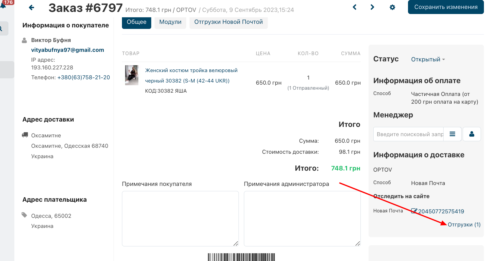 На фото показано как выглядит в разделе Отгрузки Новой Почтой