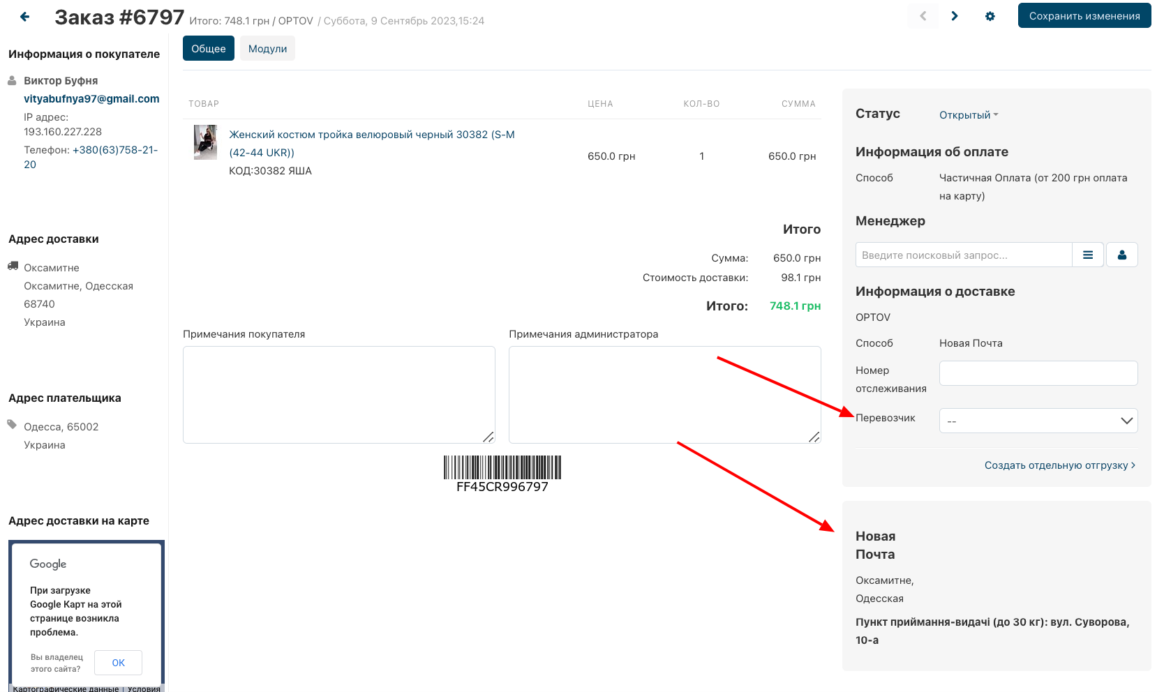 При просмотре заказа Вы можете видеть выбранное пользователем отделение. Также, Вы можете сменить его при редактировании заказа. Над этим полем находится ссылка создания отгрузки.