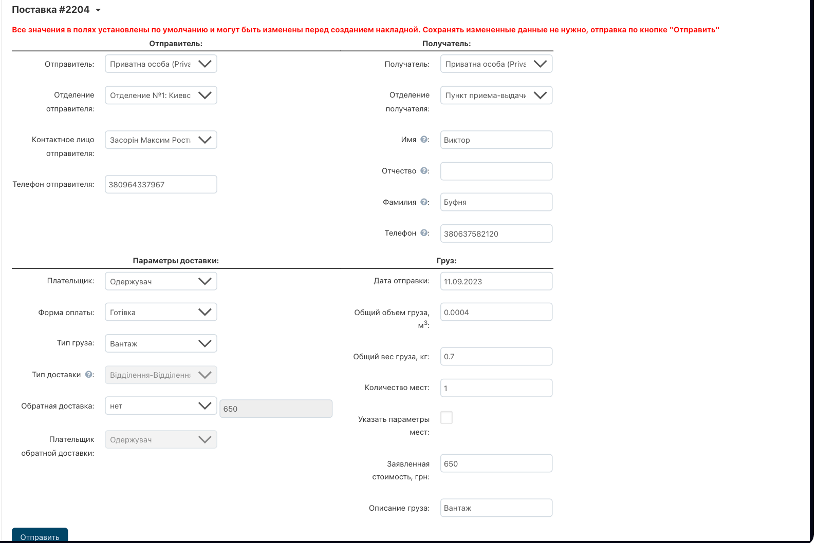 Обратите внимание, что в процессе создания накладной могут возникнуть ошибки (создание ЭН будет прервано и Вы снова увидите форму) или уведомления (ЭН будет успешно создана). Полный список и расшифровку ошибок Вы можете увидеть в на сайте Новая Почта в разделе FAQ. Но зачастую эти сбои на стороне новая почта в течении 1-2 минуты устраняются.