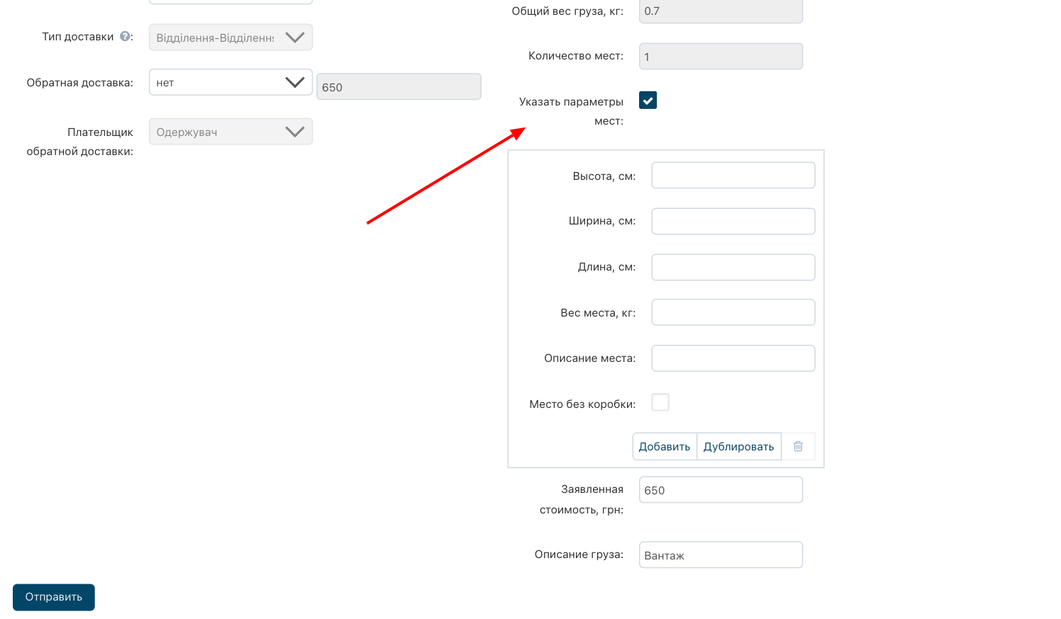 На странице создания электронной накладной (ЭН) присутствует возможность указать параметры мест вручную. Для этого установите чекбокс напротив поля Указать параметры мест и заполните поля, появившиеся ниже. Вы можете регулировать количество мест с помощью кнопок Дублировать, Добавить или Удалить.