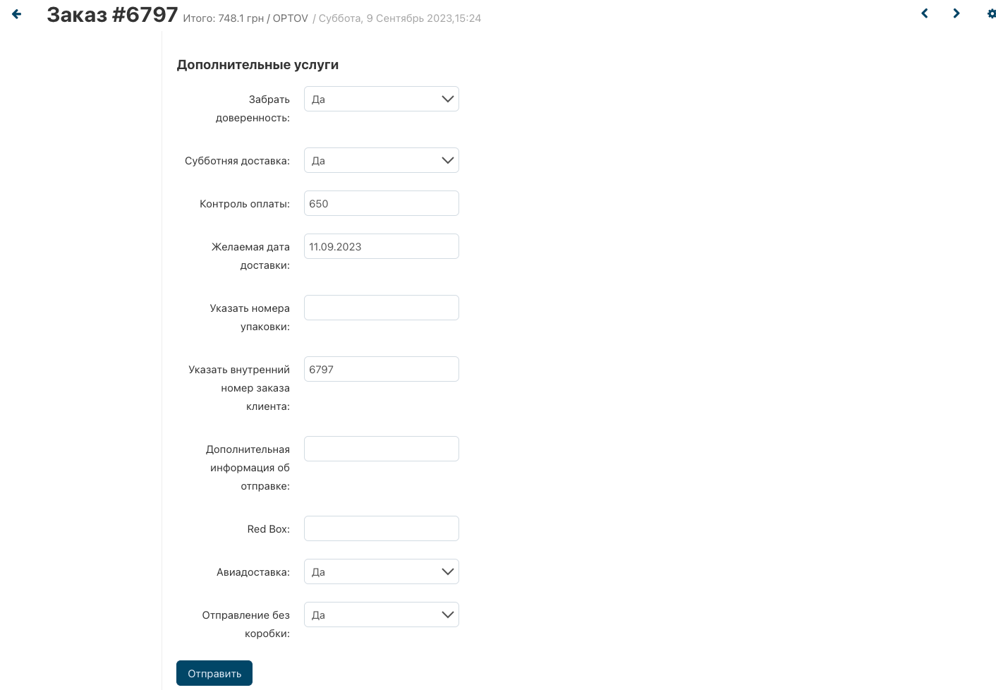 В результате, при редактировании заказа с отгрузкой, во вкладке Отгрузки Новой Почтой будет присутствовать блок Дополнительные услуги с уже заполненными полями.
