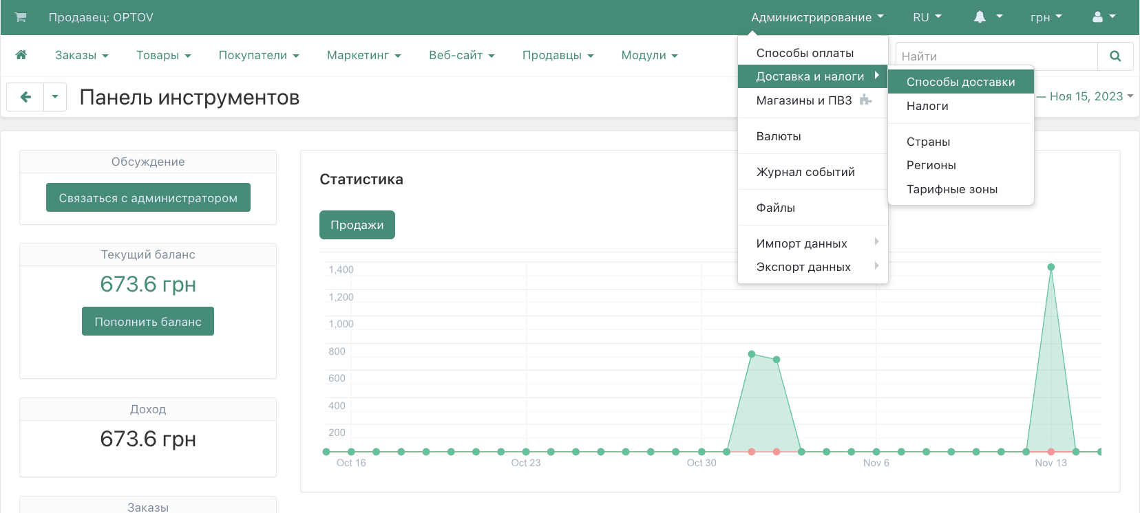 1. Заходим в Кабинет продавца и выбираем в панели инструментов раздел Администрирование → пункт Доставка и налоги → Способы доставки.