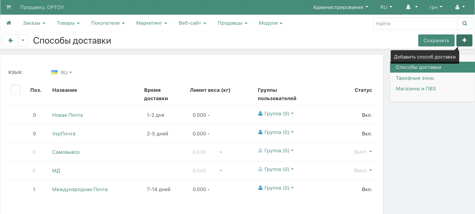 2. Справа верху нажмите [+] Добавить способ доставки.