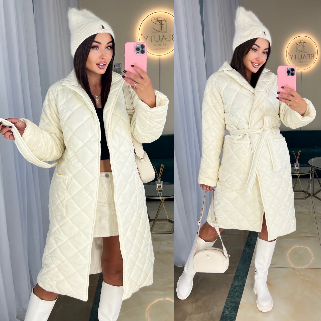 Женское теплое пальто длинное молочное с поясом 675, Цвет: Молочный, Размер: M (44 UKR), фото