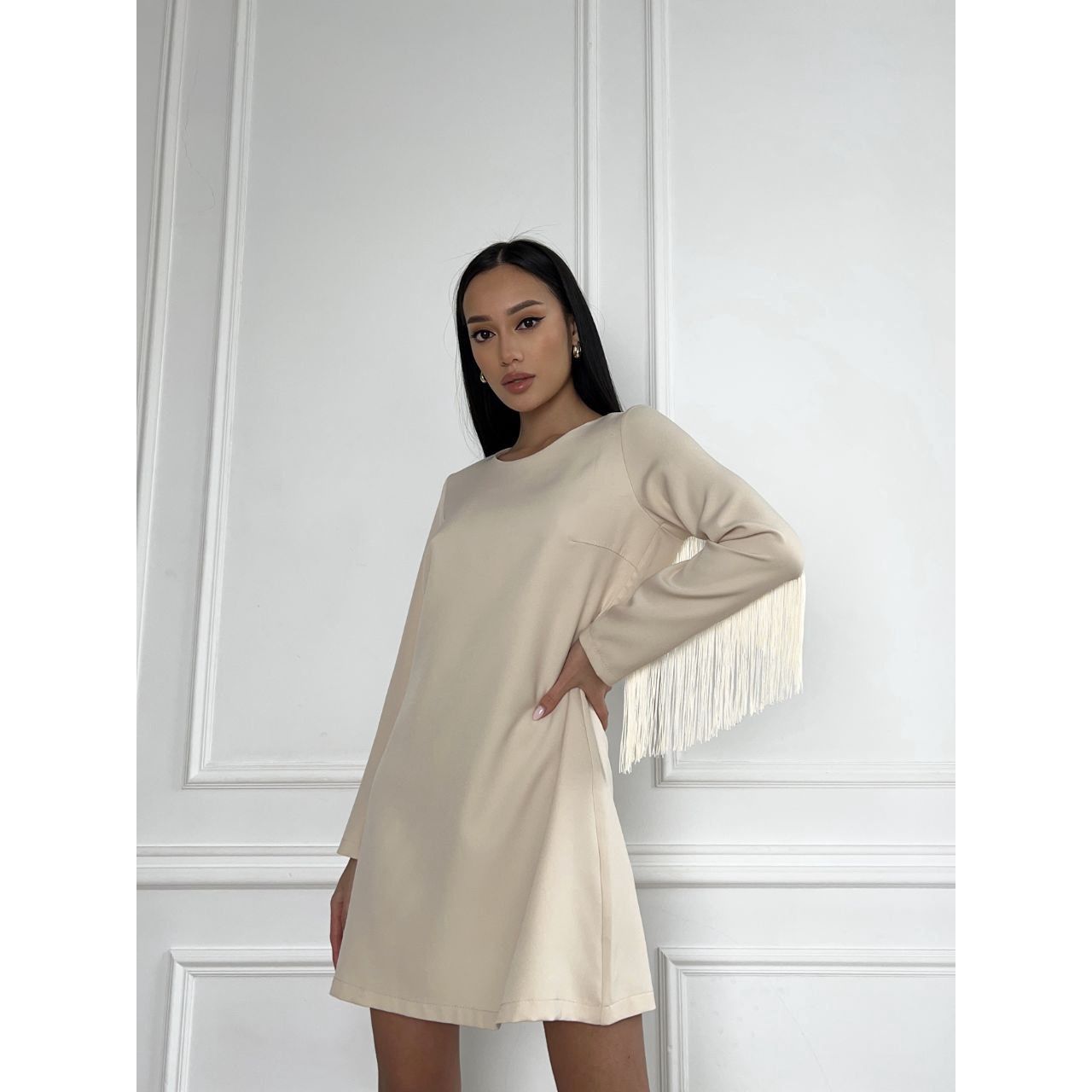 Платье женское мини с длинным рукавом цвет миндаль 7252