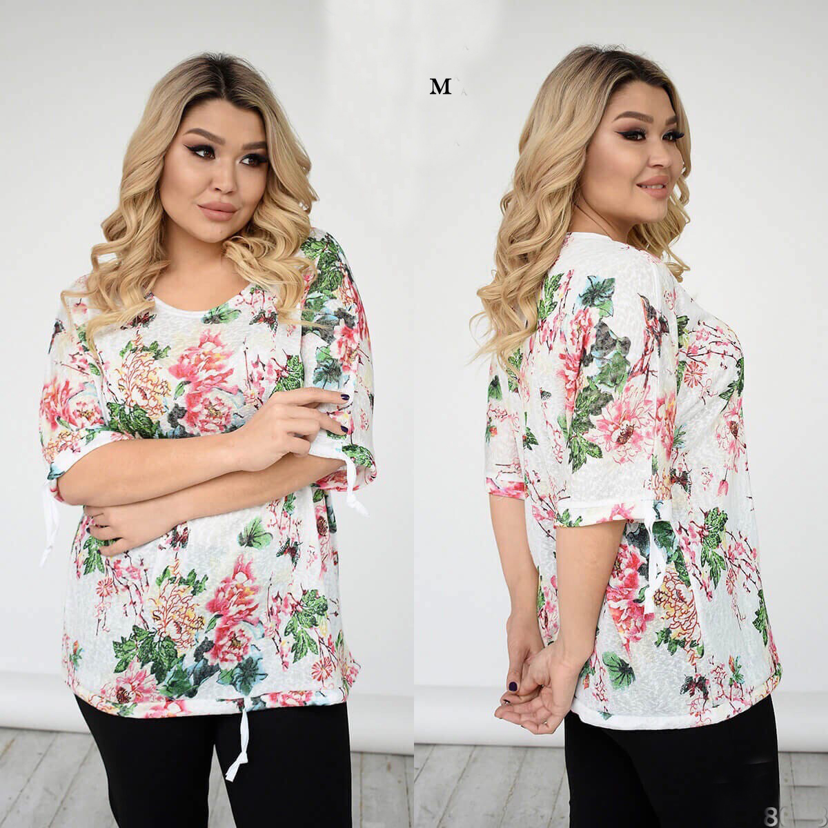 Оригінальна блузка на зав'язках - легка і яскрава основа для створення різнопланових образів на кожен день, в офіс, на прогулянки або інших важливих заходів. Вільний силует вигідно підкреслює фігуру, приховуючи деякі недоліки. Рукава скроєні цілісно, довжиною по лікоть, внизу регулюються по ширині внутрішньої зав'язкою, яка гармонійно поєднується з куліскою по низу блузки. Легка приємна до тіла тканина яскравого квіткового забарвлення додасть легкості, невагомості і нотки романтичного характеру образу. Розтяжність тканини хороша.