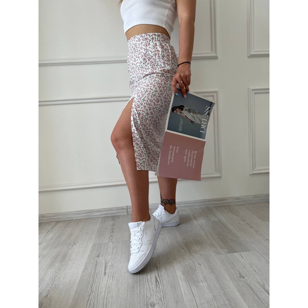 Мінімальна кількість для "Стильна спідниця з розрізом по лінії стегна біла 149" є 1.