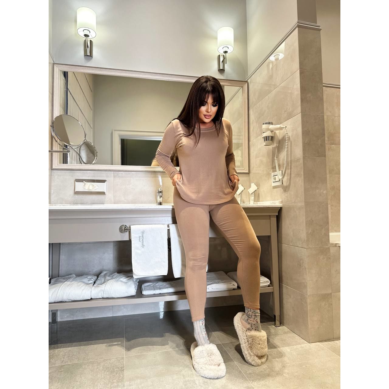 - Тканина високоякісний м'який трикотаж на флісі. М'яке та дуже приємне до тіла. Хороша розтяжність тканини, висока посадка у лосинах