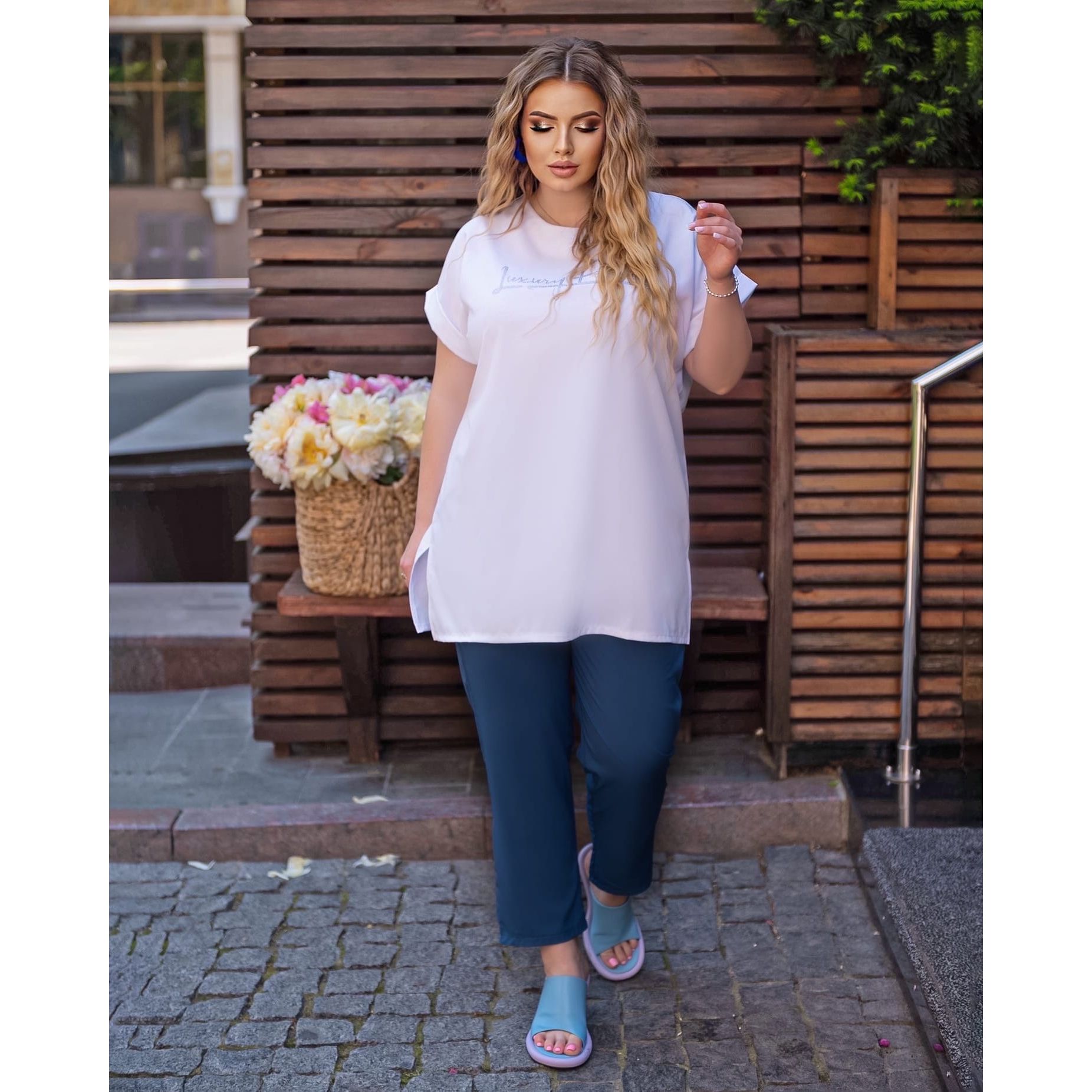 Жіночий прогулянковий костюм штани та футболка колір джинс 1033, Колір: Джинс, Розмір: 58-60, фото