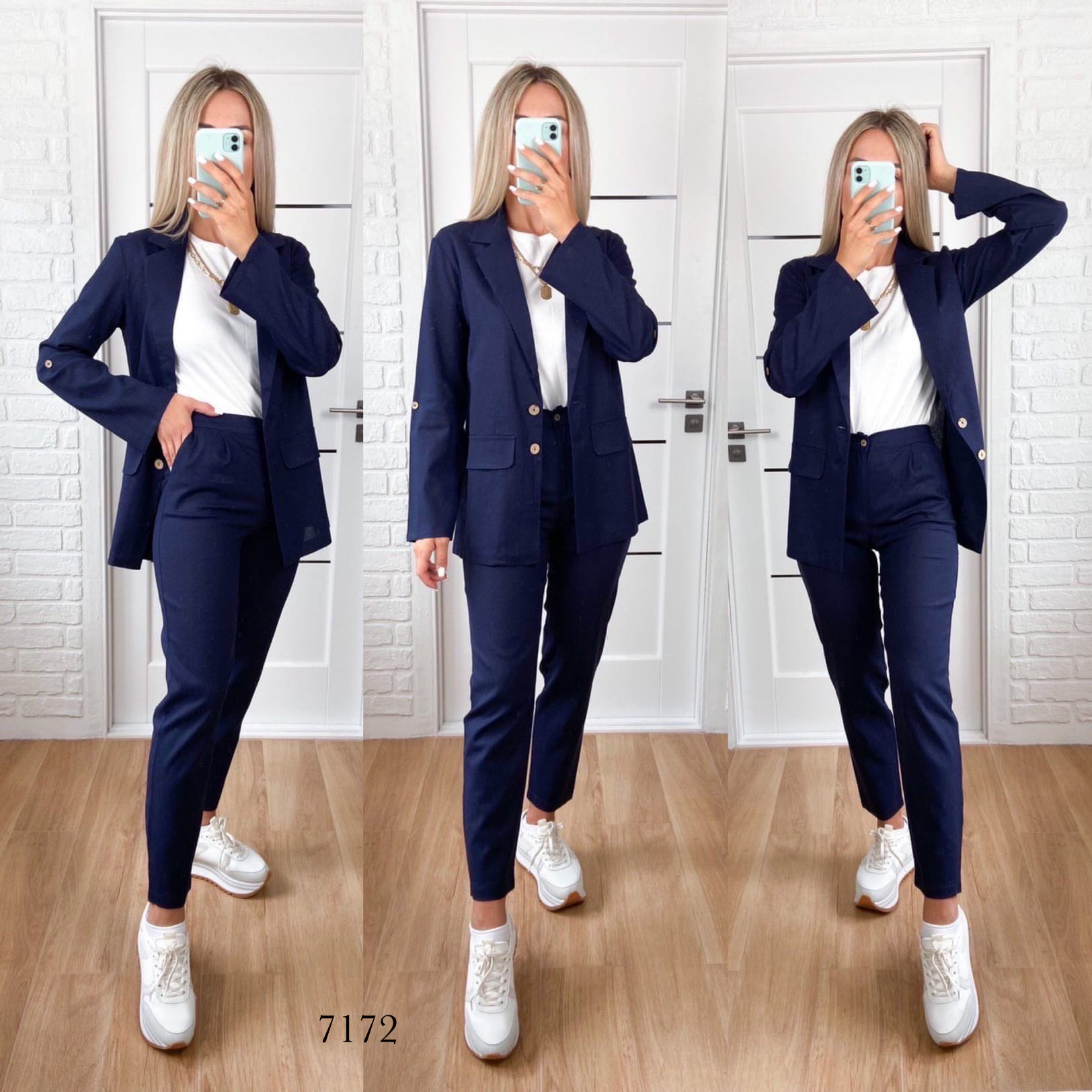 Жіночий брючний костюм колір темно-синій піджак і штани завужені 7172