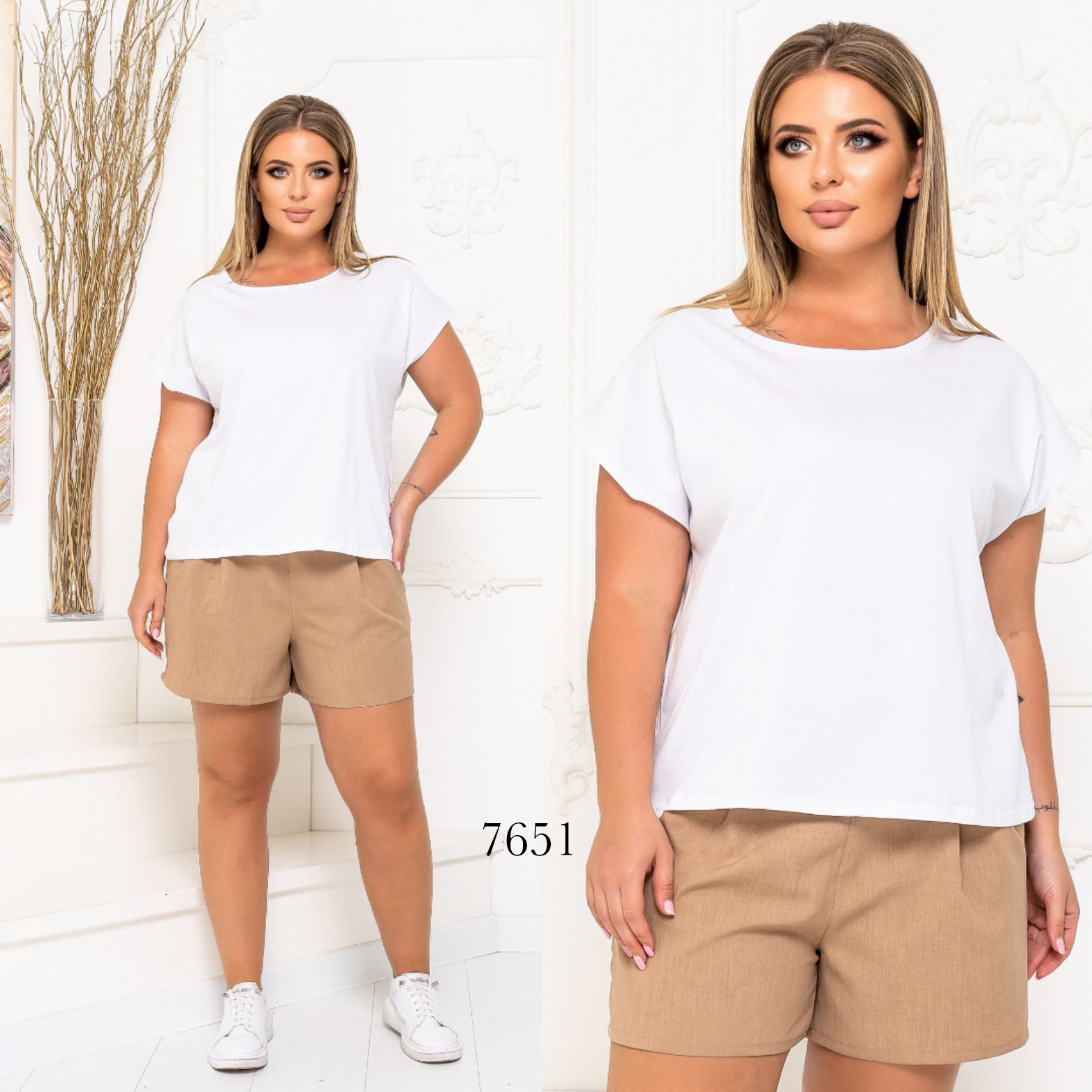 - Футболка вільного крою, широка і вільна, шорти з льону, з кишенями, середньої посадки ззаду на гумці