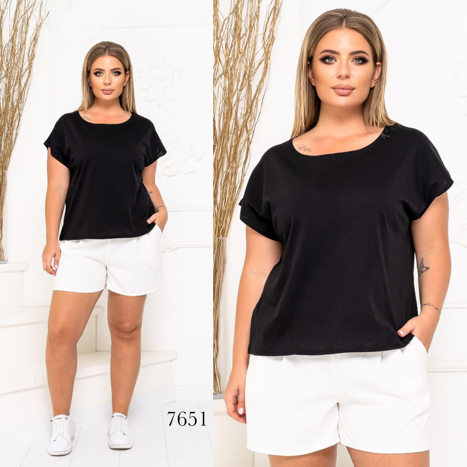 - Футболка вільного крою, широка і вільна, шорти з льону, з кишенями, середньої посадки ззаду на гумці