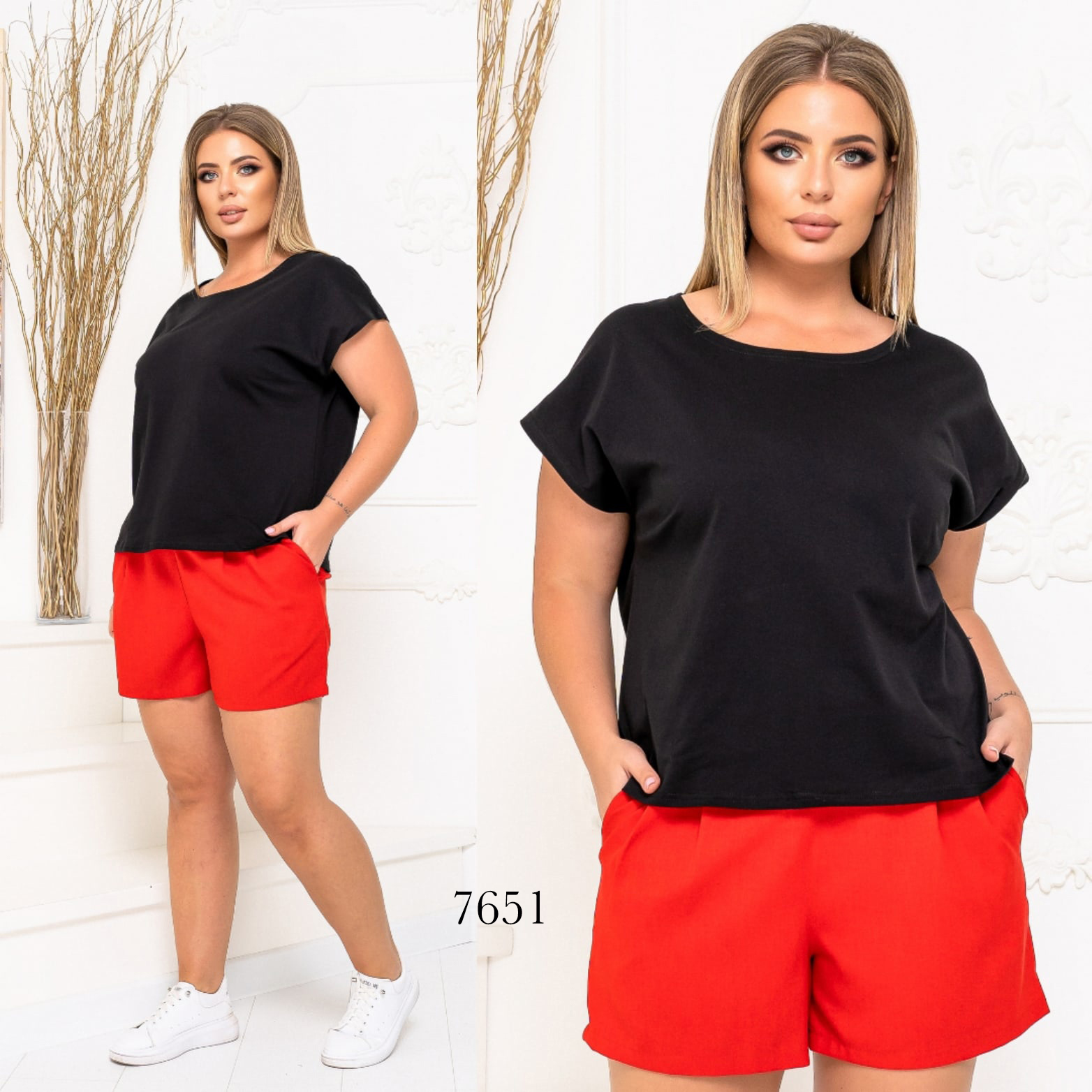 - Футболка вільного крою, широка і вільна, шорти з льону, з кишенями, середньої посадки ззаду на гумці