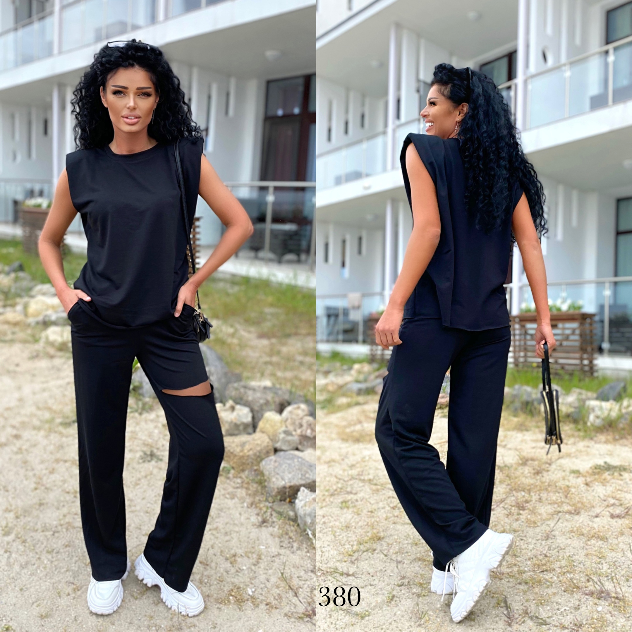 Мінімальна кількість для "Жіночий молодіжний костюм штани рвані і футболка колір чорний 380" є 1.