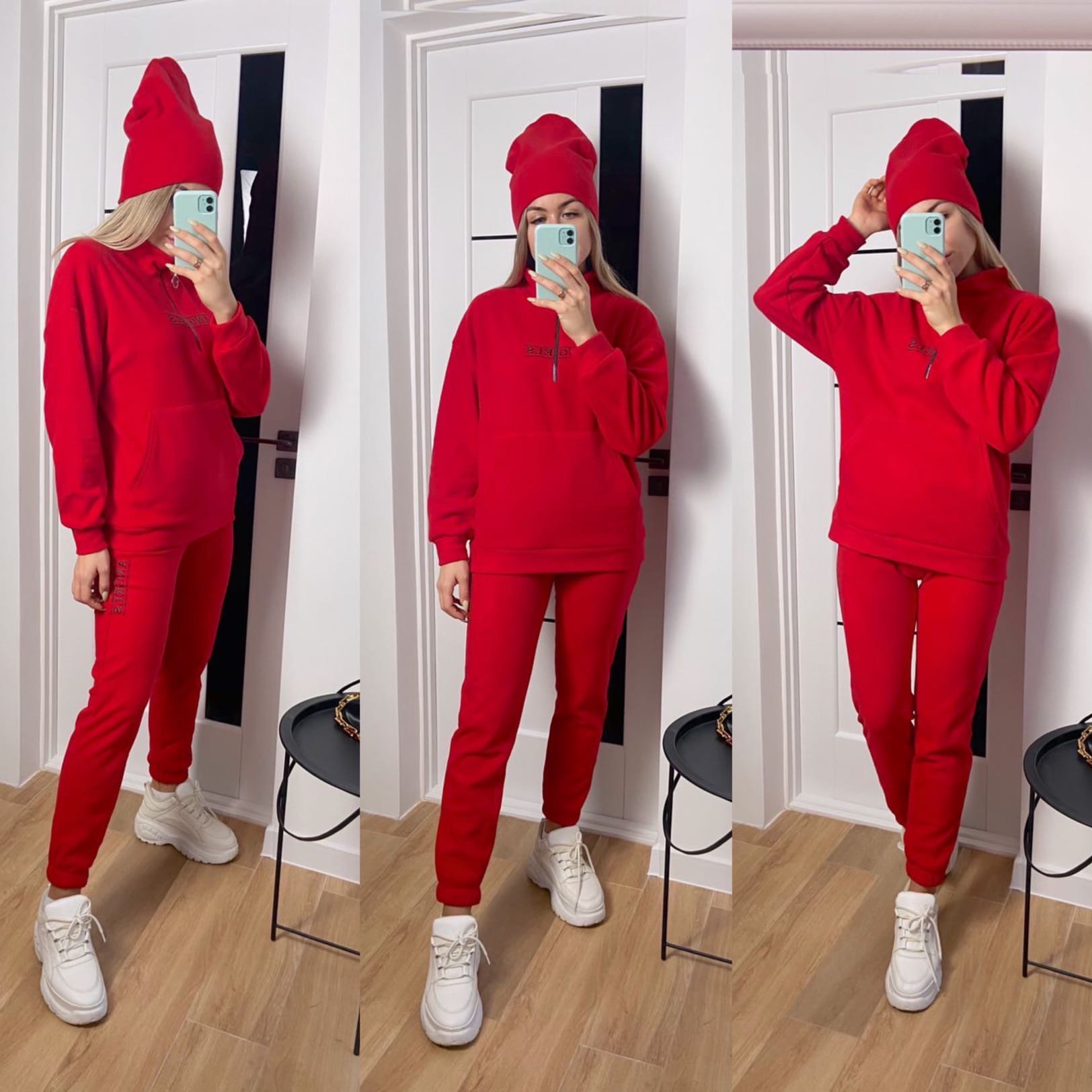 Мінімальна кількість для "Жіночий затишний теплий костюм трійка штани кофта та шапка колір червоний 7210" є 1.