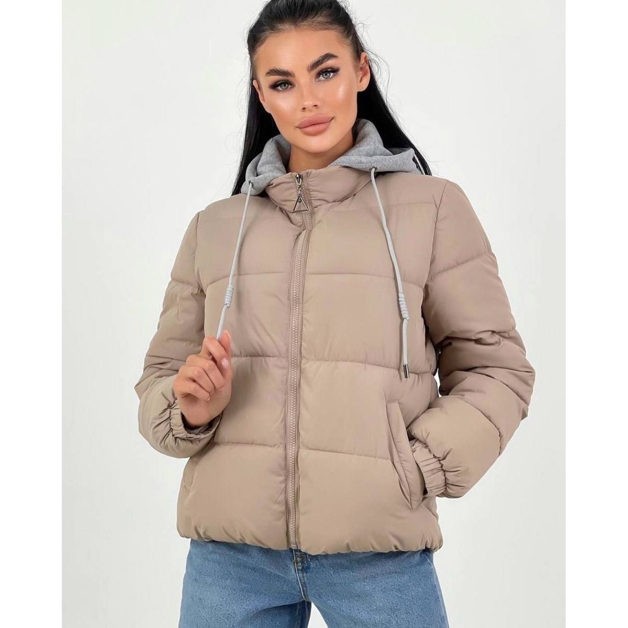 Женская короткая куртка с капюшоном бежевая 631