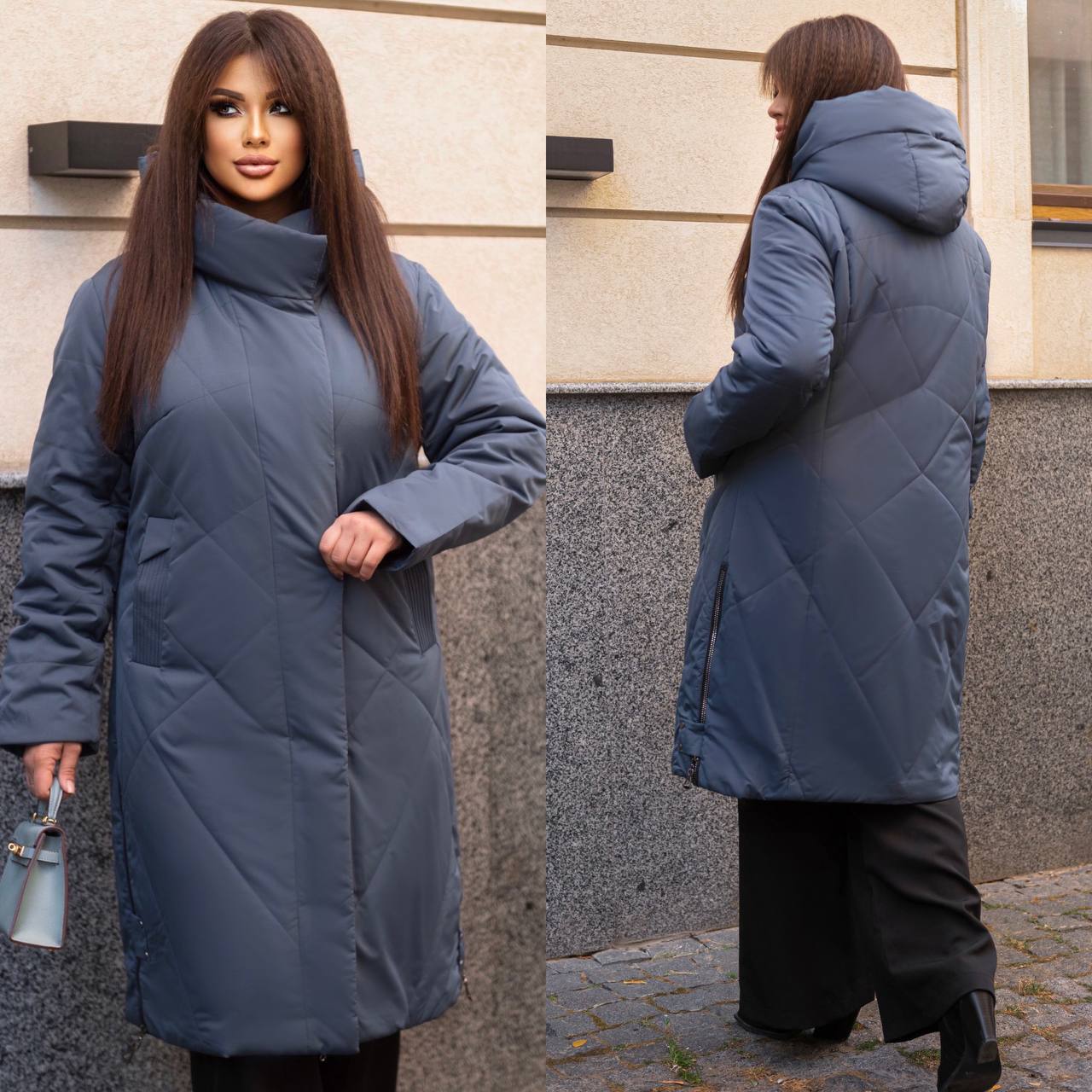 Женское теплое пальто графитовое с капюшоном 4409-2308, Цвет: Графит, Размер: 64-66 UKR, фото