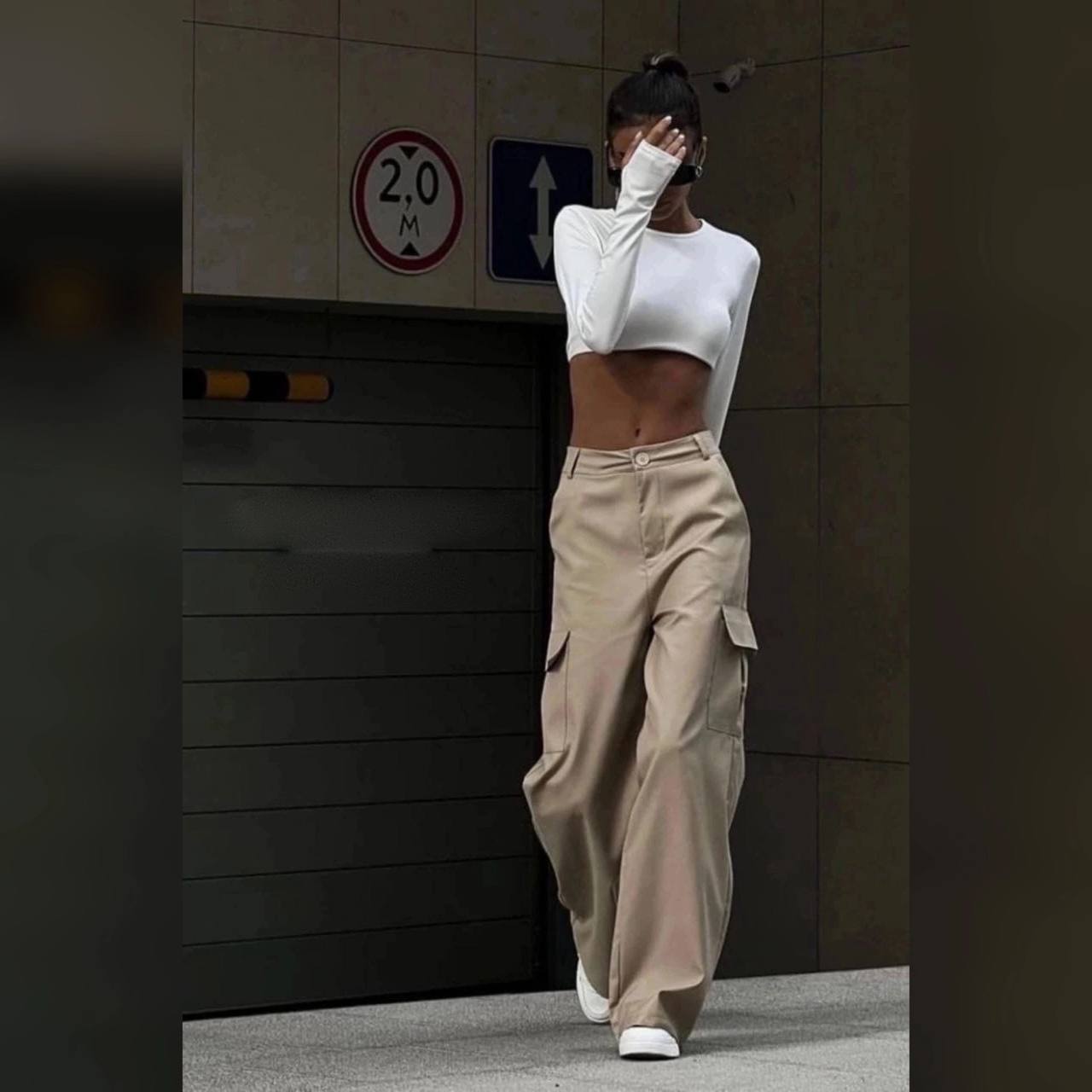 Женские спортивные штаны модные с карманами по бокам цвет бежевый 872/1872