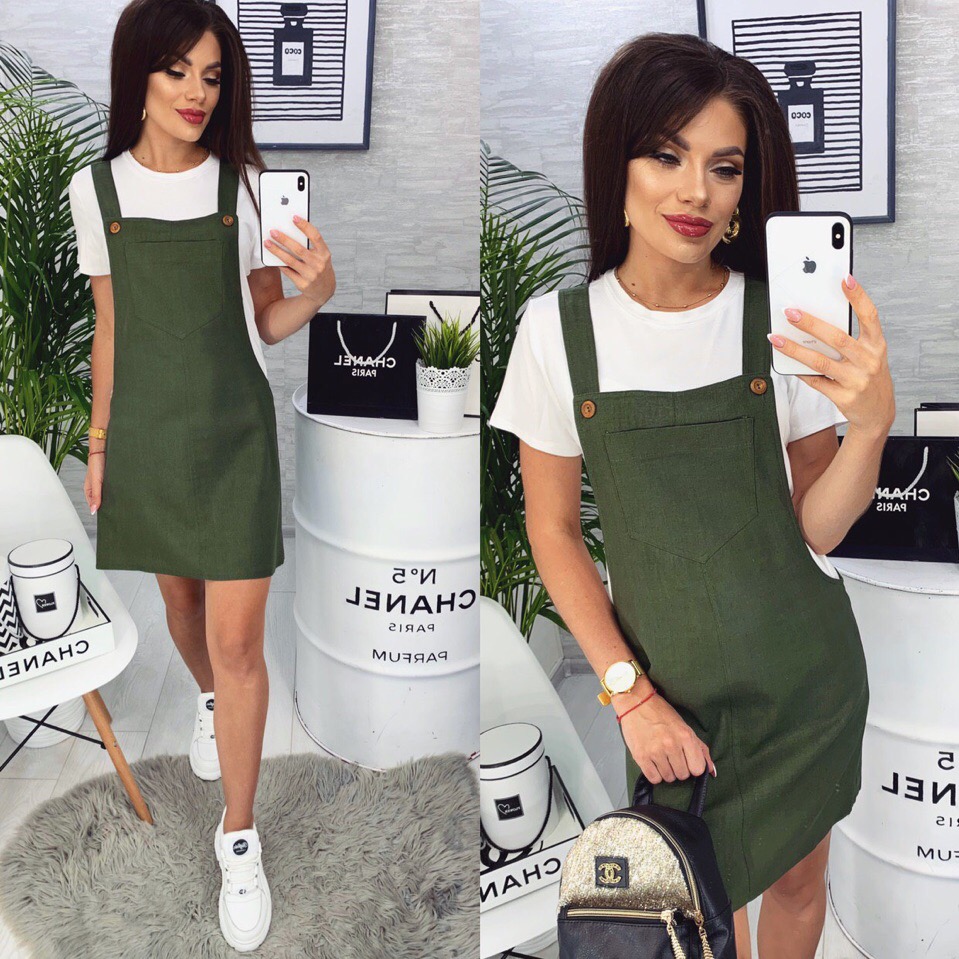 Женский костюм двойка сарафан и футболка цвет хаки 7124, Цвет: Хаки, Размер: L-XL (46-48 UKR), фото