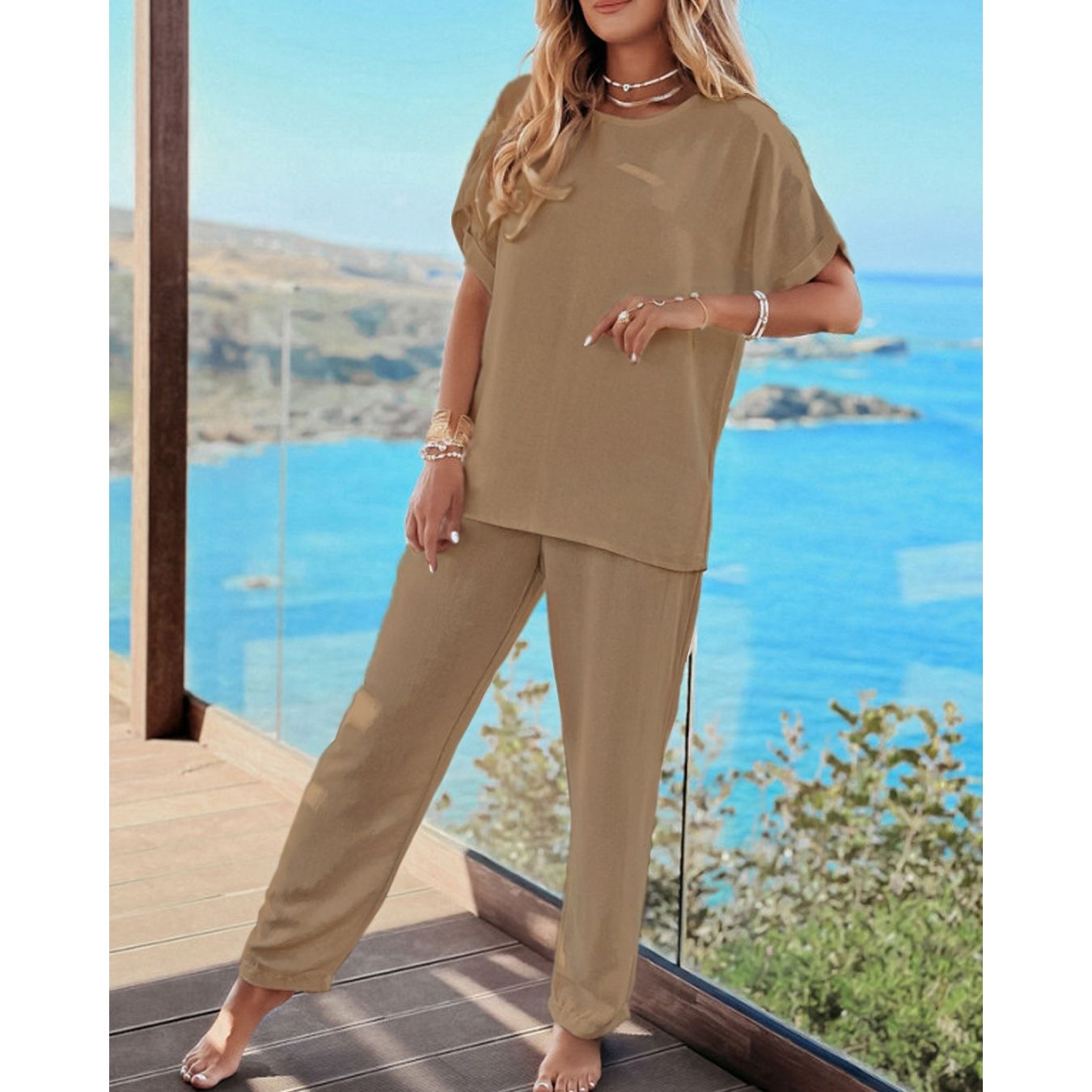 Женский костюм летний блузка и штаны прямые цвет кофейный 1986