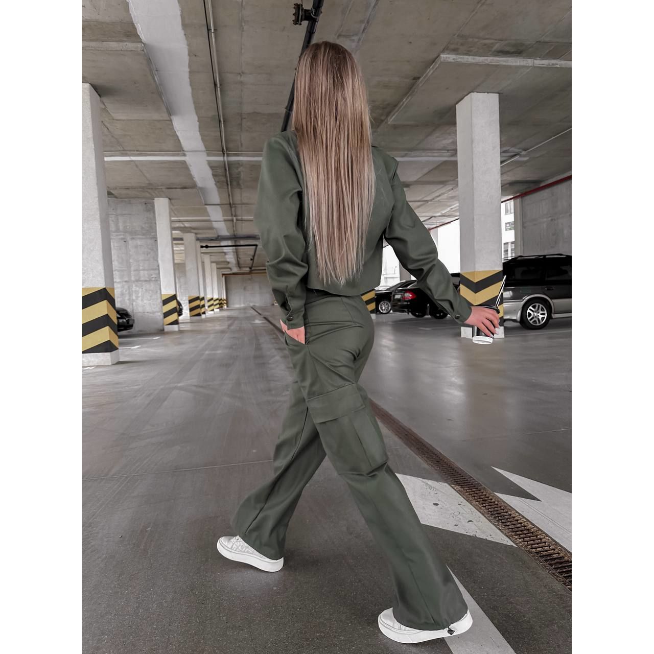 Костюм двойка ,брюки карго с карманами, утяжкой по низу и укороченный пиджак-рубашка .