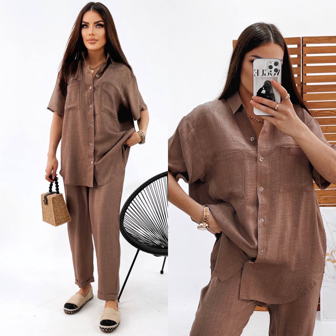 Женский прогулочный костюм рубашка и брюки прямые цвет бежевый 395, Цвет: Кофейный , Размер: 54-58 UKR (One size), фото