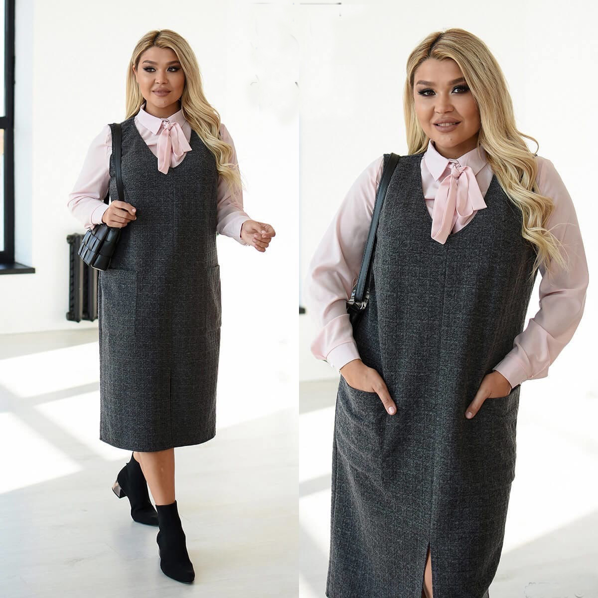 Элегантный сарафан из новой коллекции – отличная база повседневному образу в стиле casual. Свободный силуэт подчеркивает формы. Накладные карманы для мелочей. Глубокое декольте и шлица визуально удлиняют фигуру. Платье из мягкого приятного к телу структурного трикотажа в составе 40% акрил, 30% шерсть, 20% полиэстер, 10% вискоза. За счет натуральных волокон ткань не вызывает аллергию, сохраняет тепло, не парит. Благодаря синтетическим добавкам, платье хорошо держит форму, не скатывается и не линяет. Растяжимость средняя. Стирка 30⁰